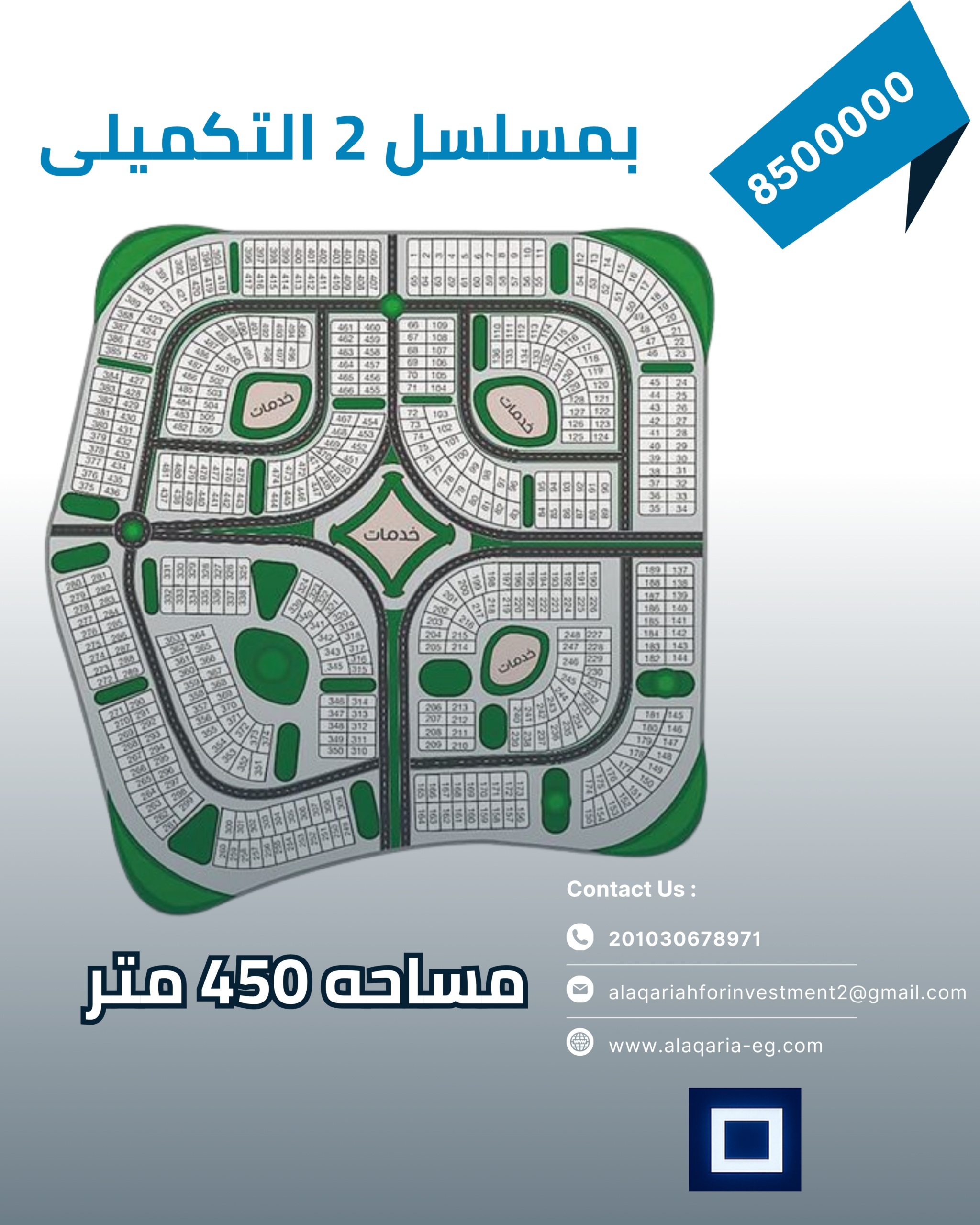 أرض للبيع حدائق أكتوبر أرض للبيع بحدائق أكتوبر – موقع مميز ومساحة ممتازة 📍 الموقع: حدائق أكتوبر – مسلسل 2 – على طريق الفيوم📌 خلف رئيسي مدينة النور – موقع راقٍ ومتكامل الخدمات ✨ تفاصيل الأرض: المساحة: 450 متر خالصة الأقساط بالكامل نسبة البناء: 55٪ رخصة بناء: بدروم + أرضي + 3 أدوار متكررة + روف كاملة المرافق (مياه – كهرباء – صرف – طرق ممهدة) 💰 المطلوب: 8,500,000 جنيه 📞 للتواصل: 01030678971#العقاريه_للاستثمار لعروض اراضى