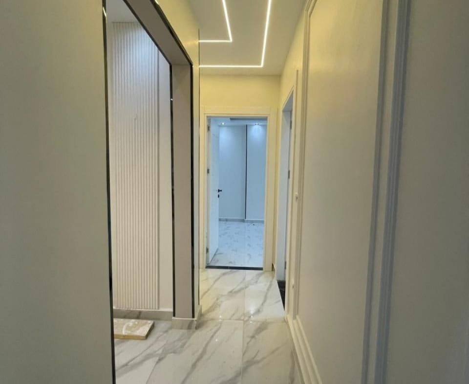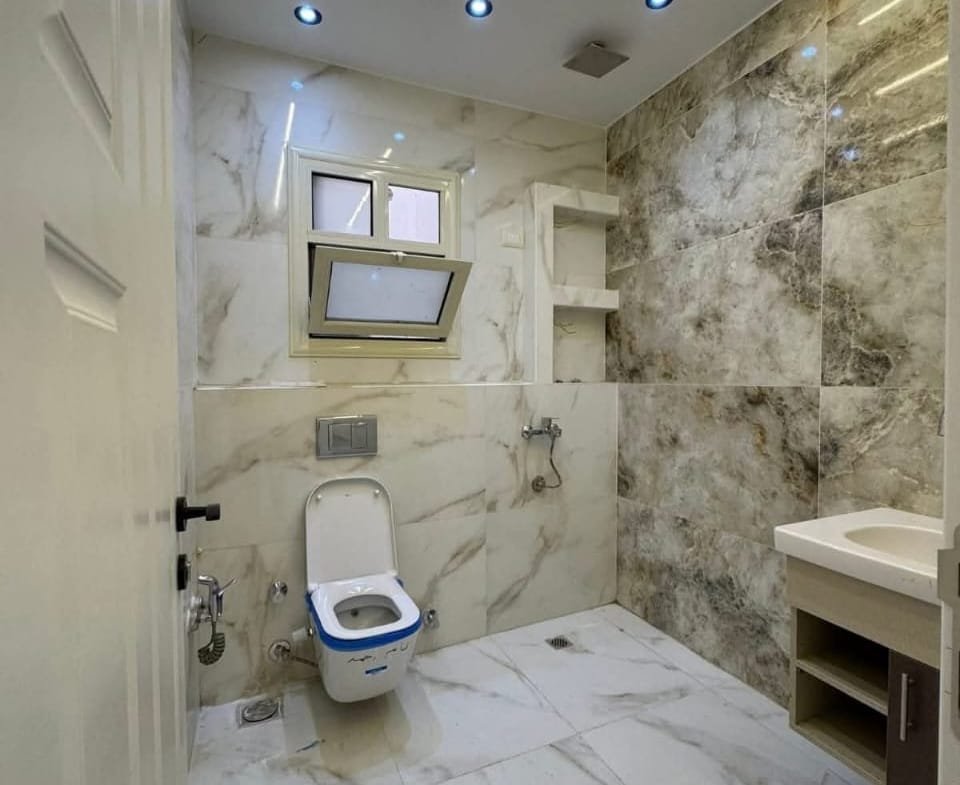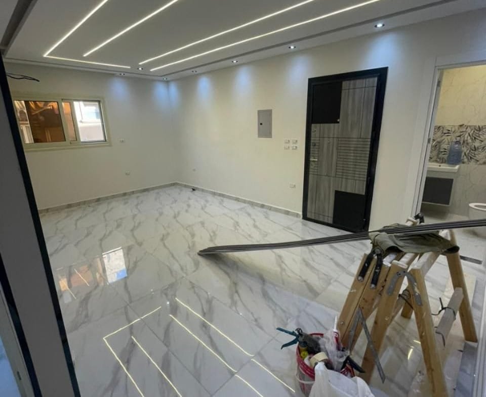 المبنى: عمارة حديثة 2025 – ناصية صريحة – واجهة حجر – مدخل رخام مودرن – أسانسير.