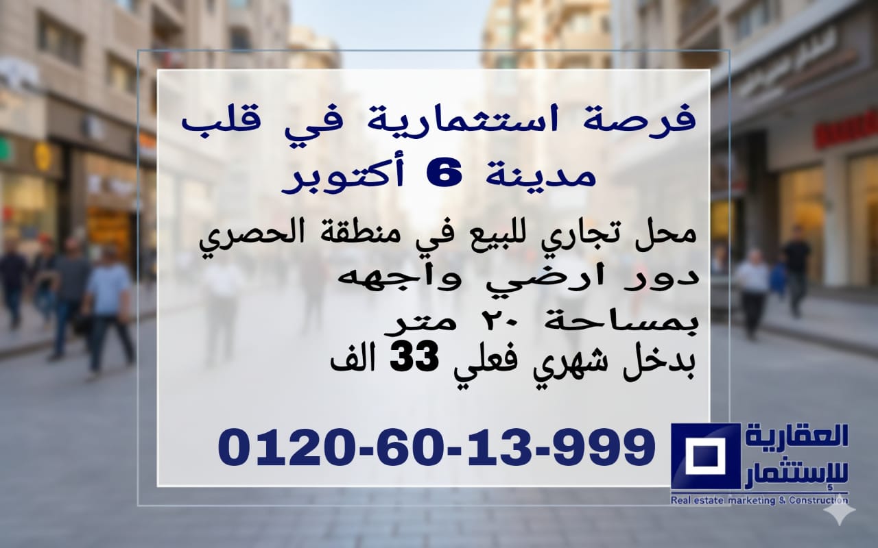 محل للبيع في الحصري 6 أكتوبر محل للبيع في منطقة الحصري – 6 أكتوبر الموقع محل تجاري للبيع في قلب منطقة الحصري بمدينة 6 أكتوبر، بموقع استراتيجي حيوي على شارع رئيسي يضمن حركة مستمرة وطلب مرتفع. المواصفات المساحة: 20 متر مربع. المستوى: دور أرضي بواجهة مباشرة على الشارع. عقد الإيجار: 5 سنوات متجددة بزيادة سنوية 10%. الإيجار الحالي: 33,000 جنيه شهريًا. السعر المطلوب: 7,000,000 جنيه (قابل للتفاوض). المميزات موقع تجاري حيوي في قلب الحصري. دخل